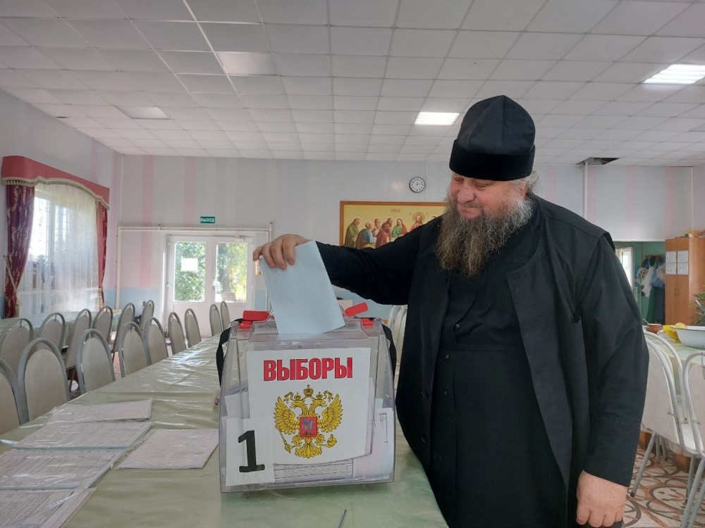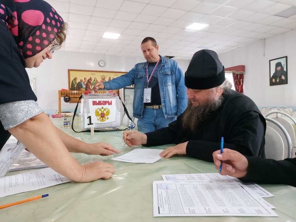 Настоятель монастыря заполнил избирательный бюллетень, предоставленный представителями избирательной комиссии, и опустил его в урну для голосования.