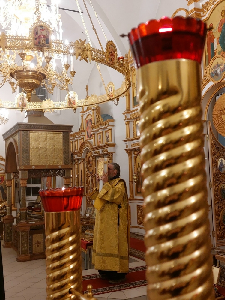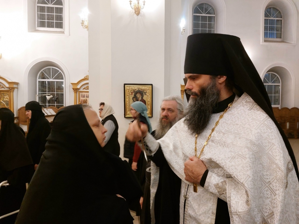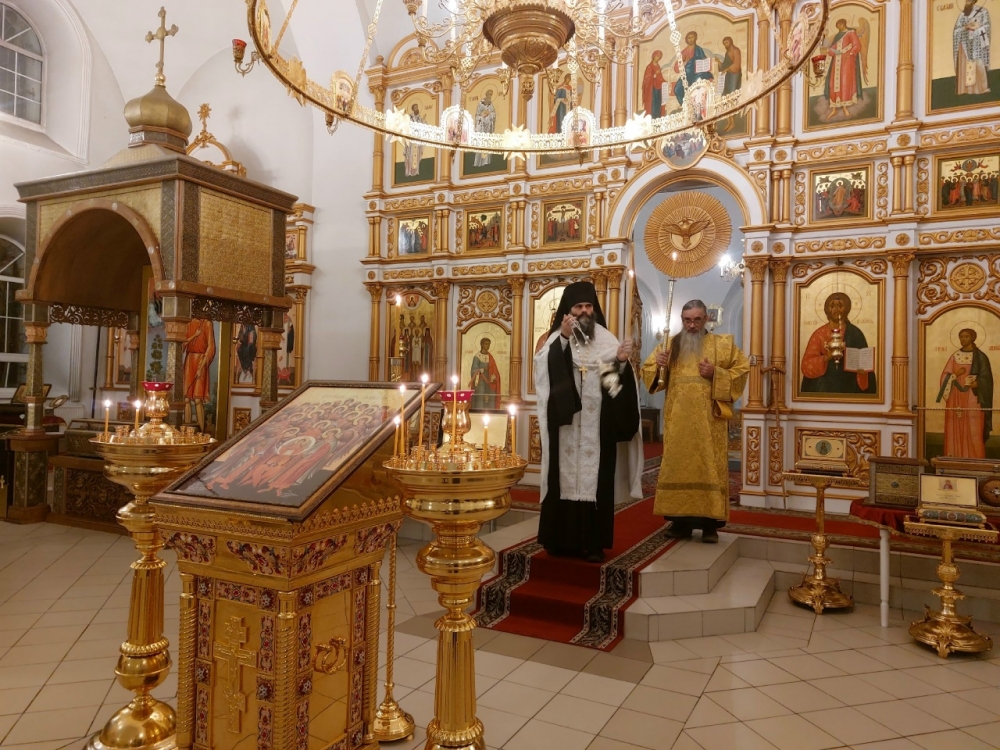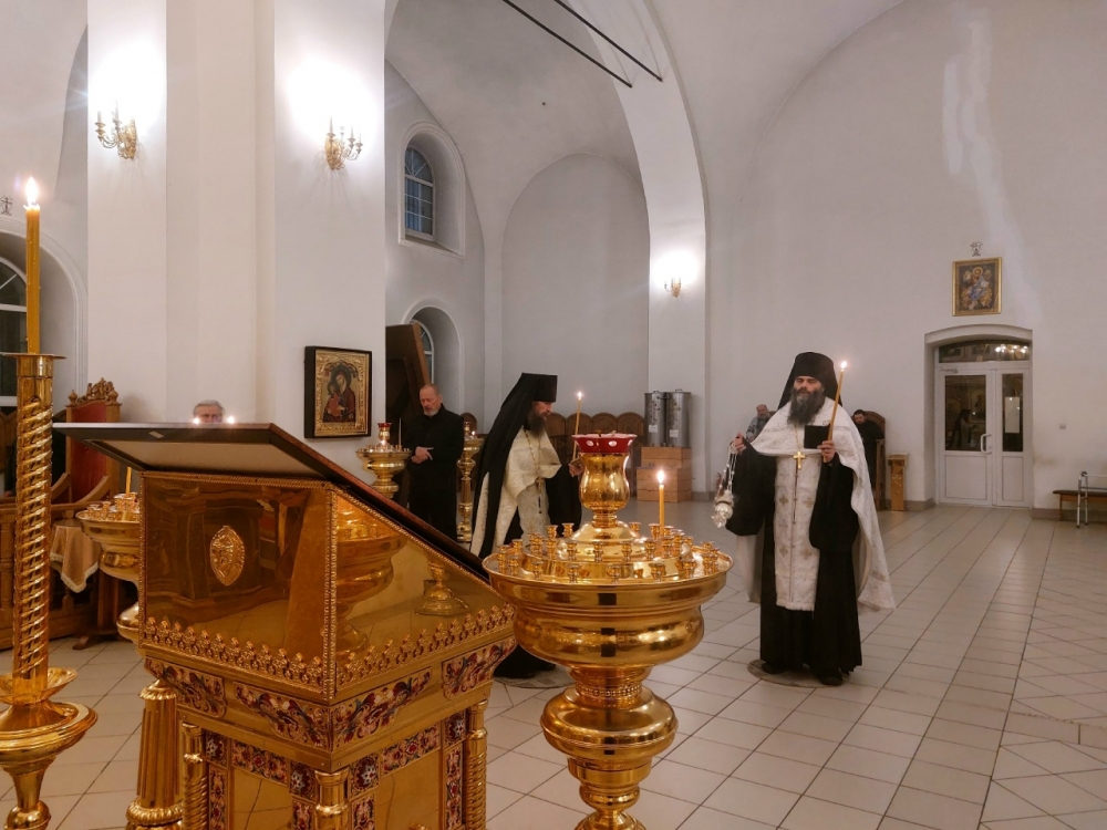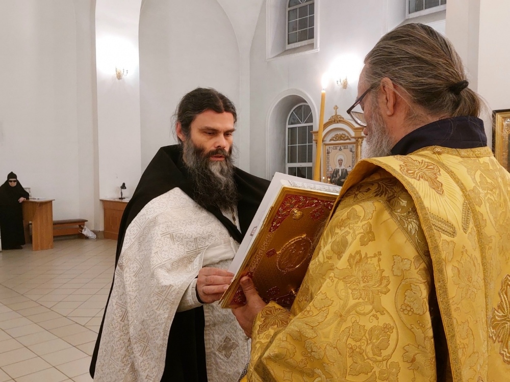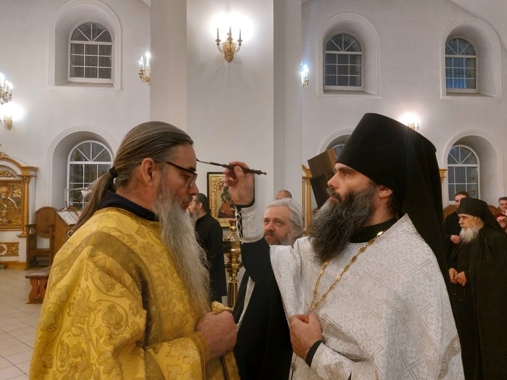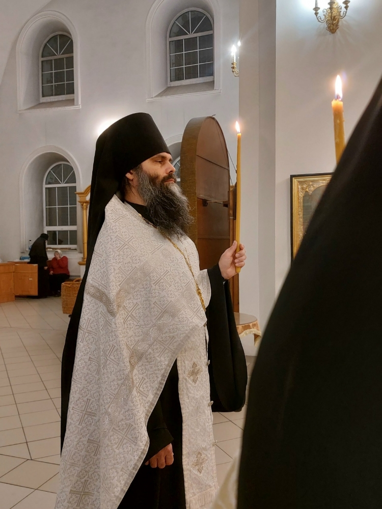 Богослужение совершил иеромонах Моисей (Голенецкий) в сослужении иеромонаха Варсонофия (Петрушева), иеромонаха Савватия (Змеева), диакона Григория (Фонского).