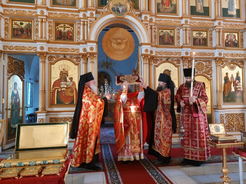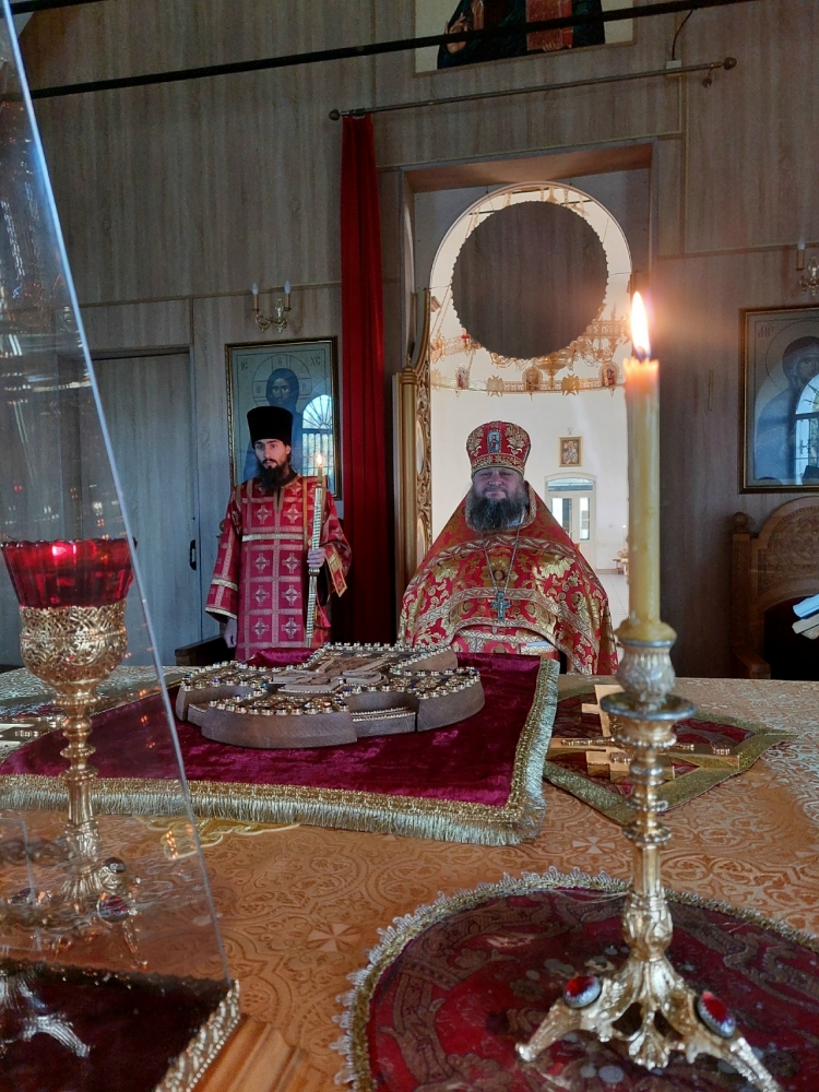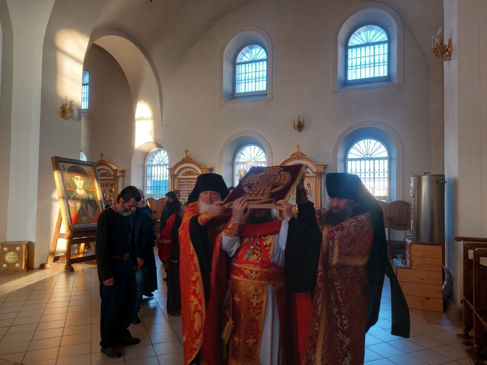 После великого славословия Крест был торжественно вынесен из алтаря и положен на центральный аналой. Братия и прихожане совершили поклонение Кресту.